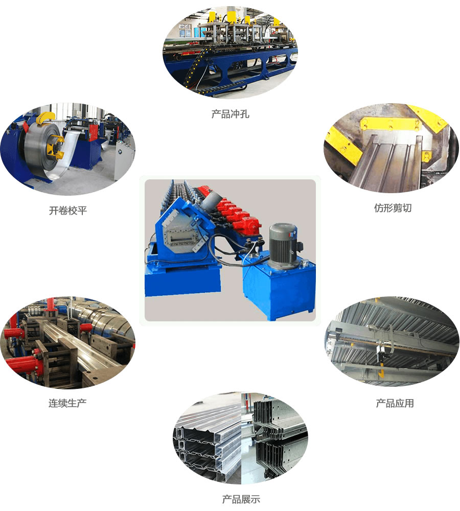 開卷—導向引料—輥壓成型—產品沖孔—仿形切斷—出料收集